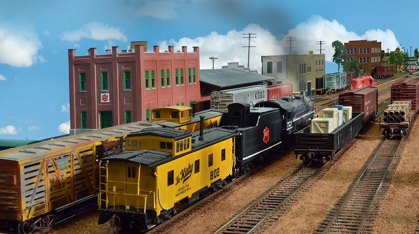 Santa Fe works local industries and finishes with a transfer run to the MKT and Frisco. Scenery is complete with enhancements ongoing. Engines and cars are weathered, and control is NCE with car card forwarding. Locomotives have sound and prototypical momentum and braking. It will slow you down, but you will get used to this rail fan experience.