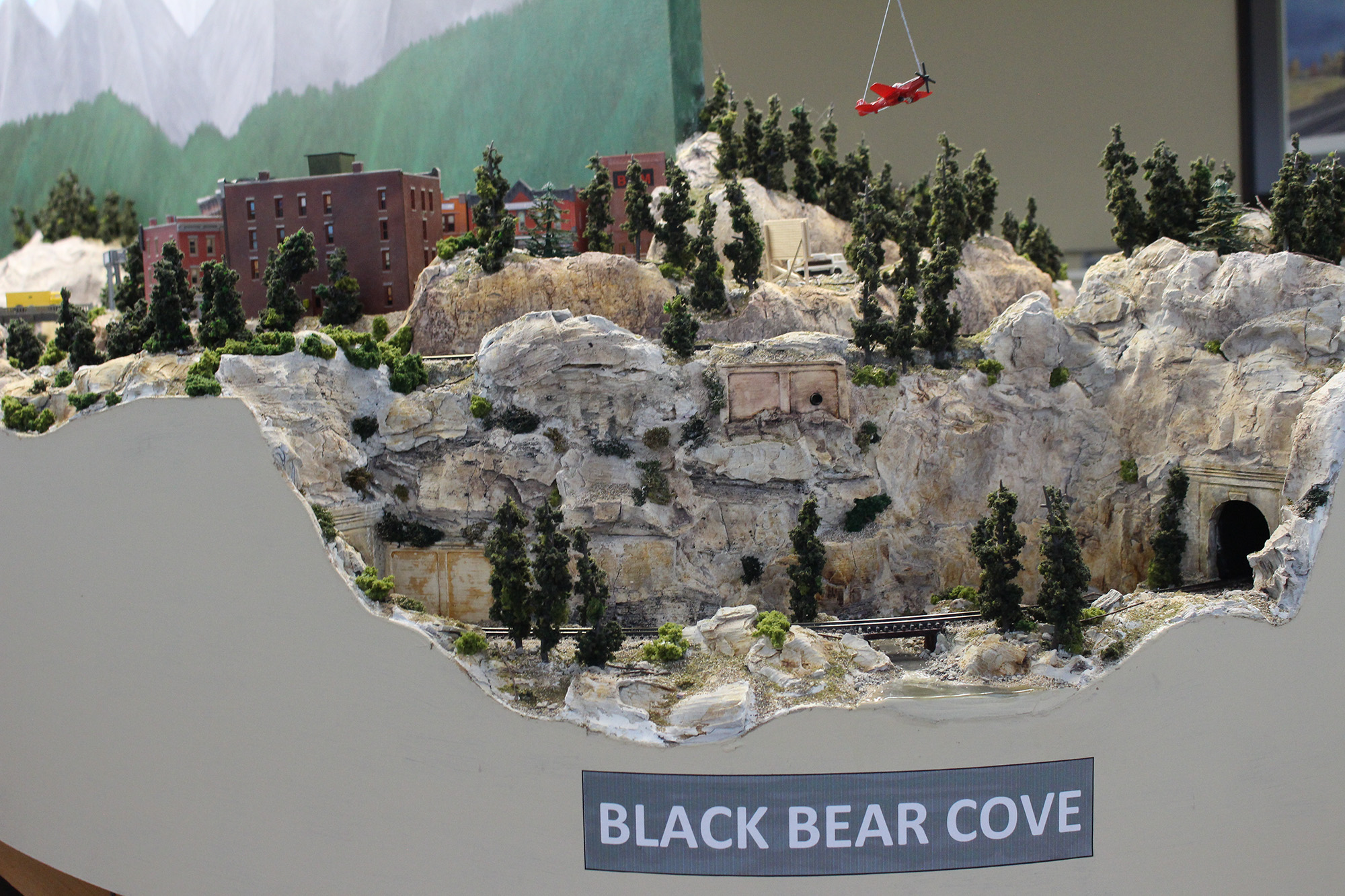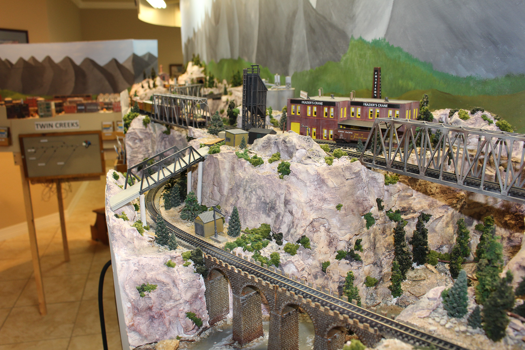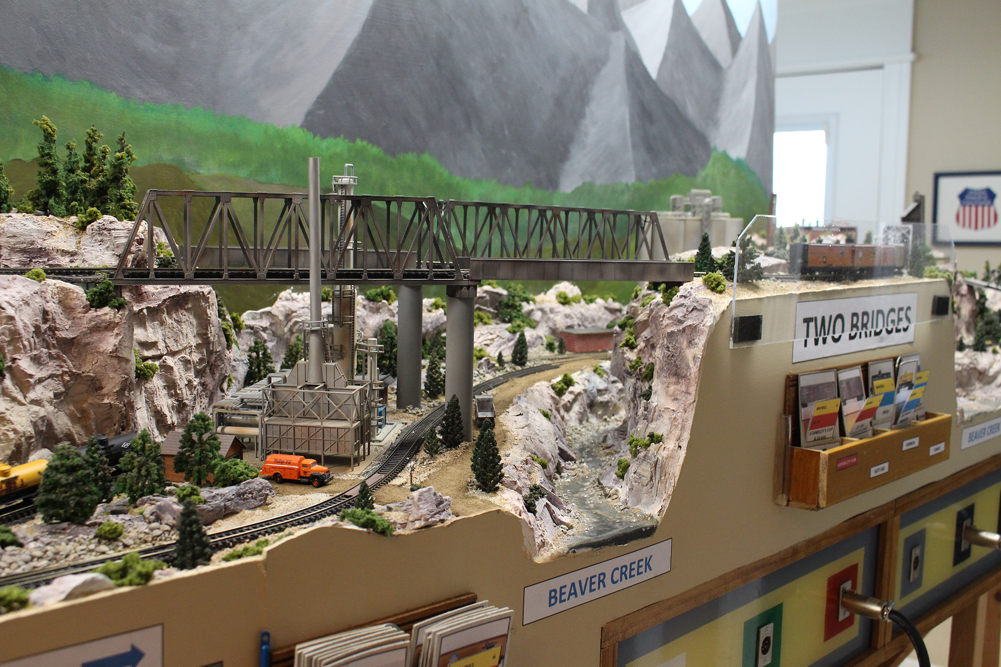 The layout has two separate lines (color coded for easy operations) that share passing sidings for easy crossover taking the 18’ by 24’ layout run about an hour to make the full circuit. Color coded car card system is used.