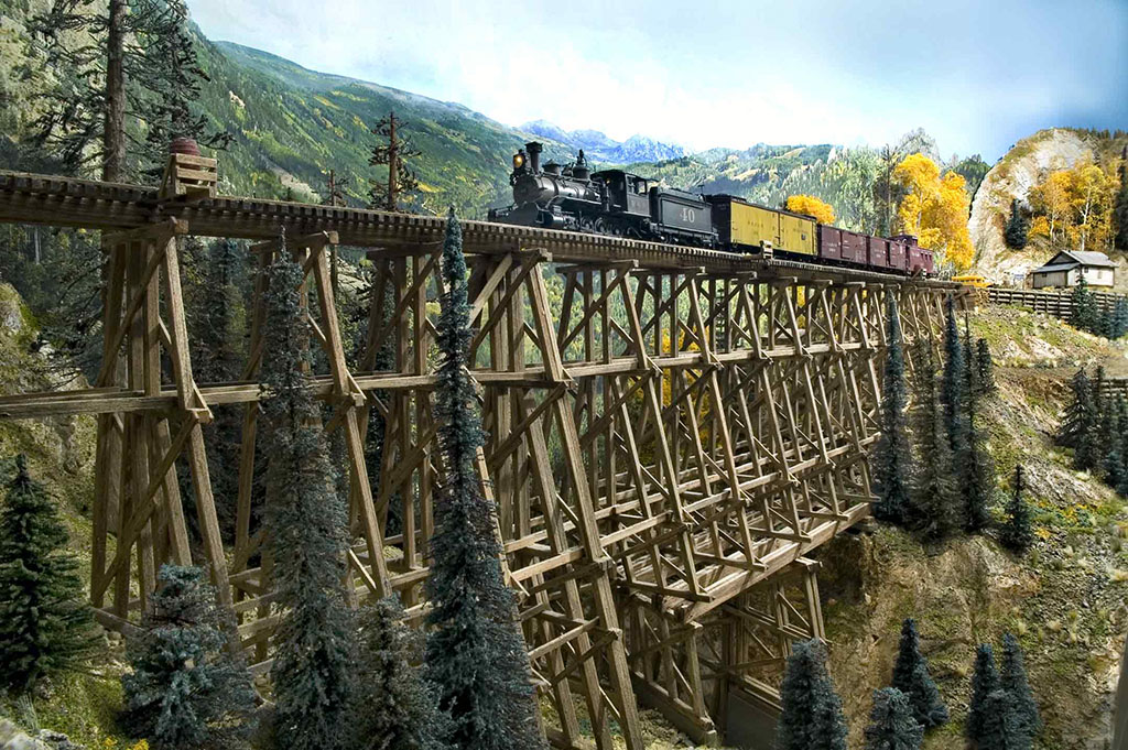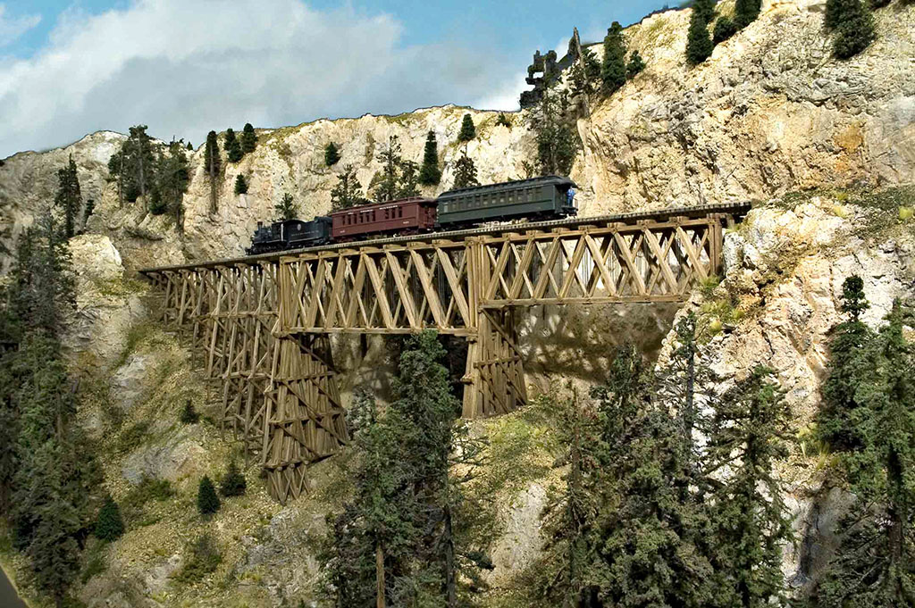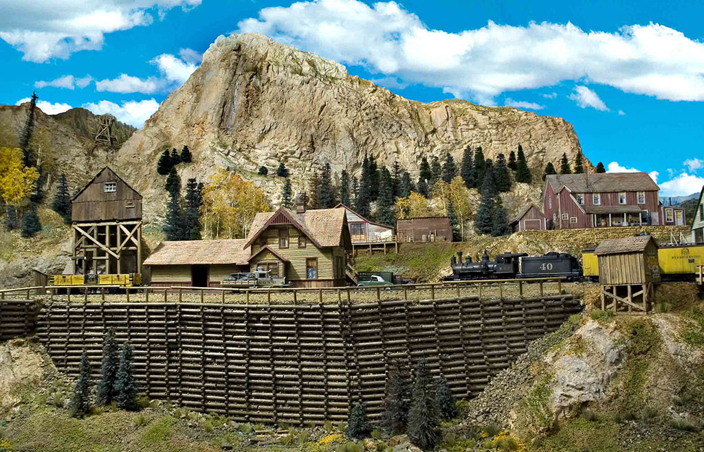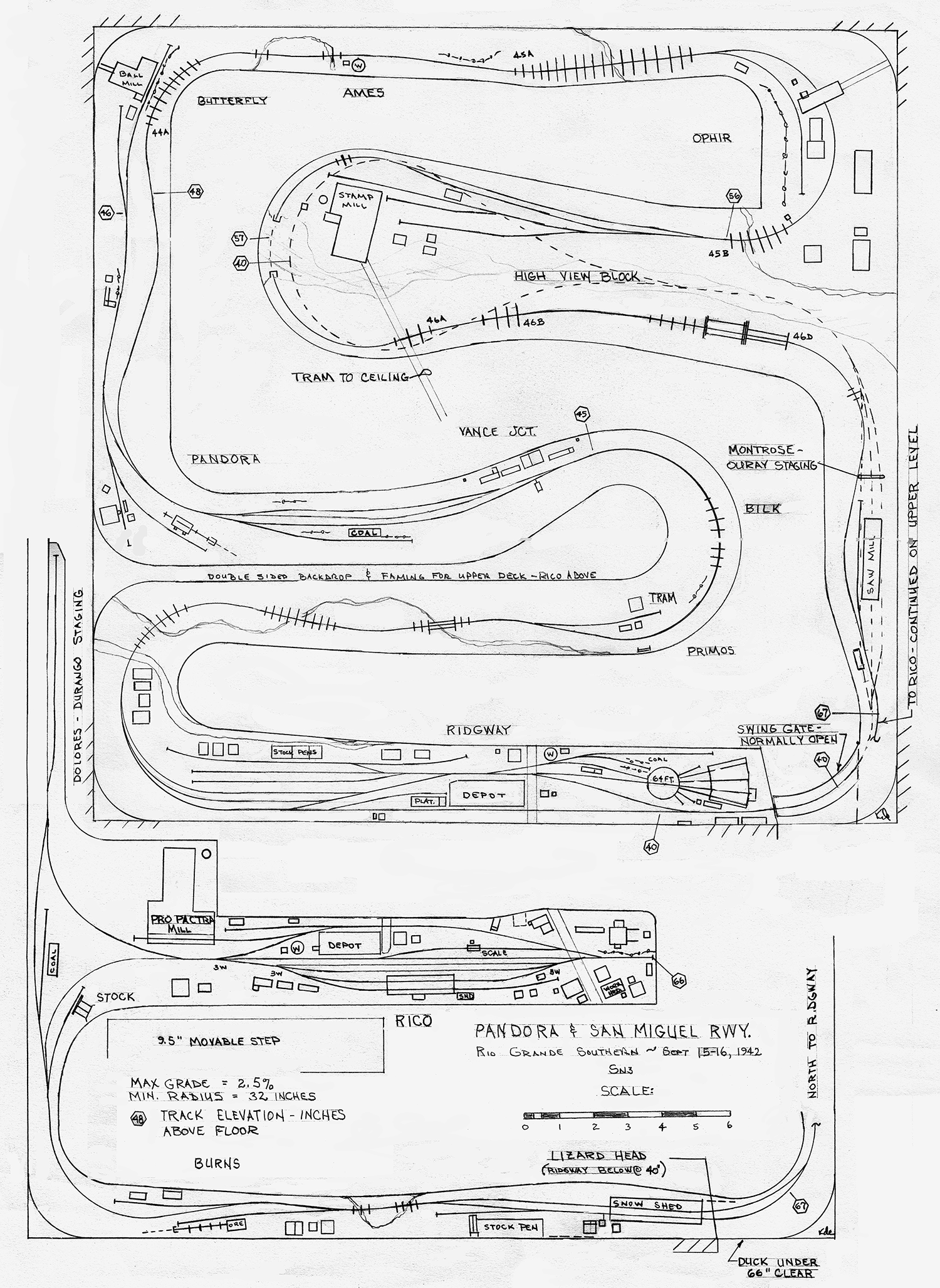 The Pandora & San Miguel depicts the southwest Colorado Rio Grande Southern in September, 1942 and includes that part of the railroad from Ridgway to Rico. The main line is 200 feet with interchange with the D&RGW at Ridgway and staging at both ends of the layout. Operation is easy paced but busy – lots of switching. Helper locos are required on most freights. Layout is about 90 percent sceniced. Locos all have Tsunami sound and run at scale speeds.